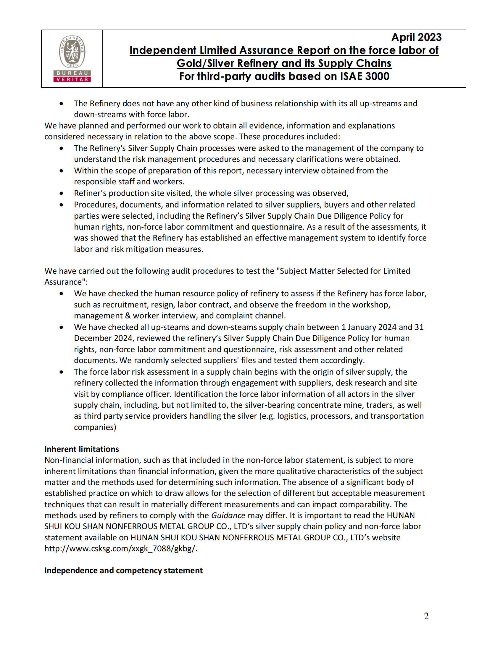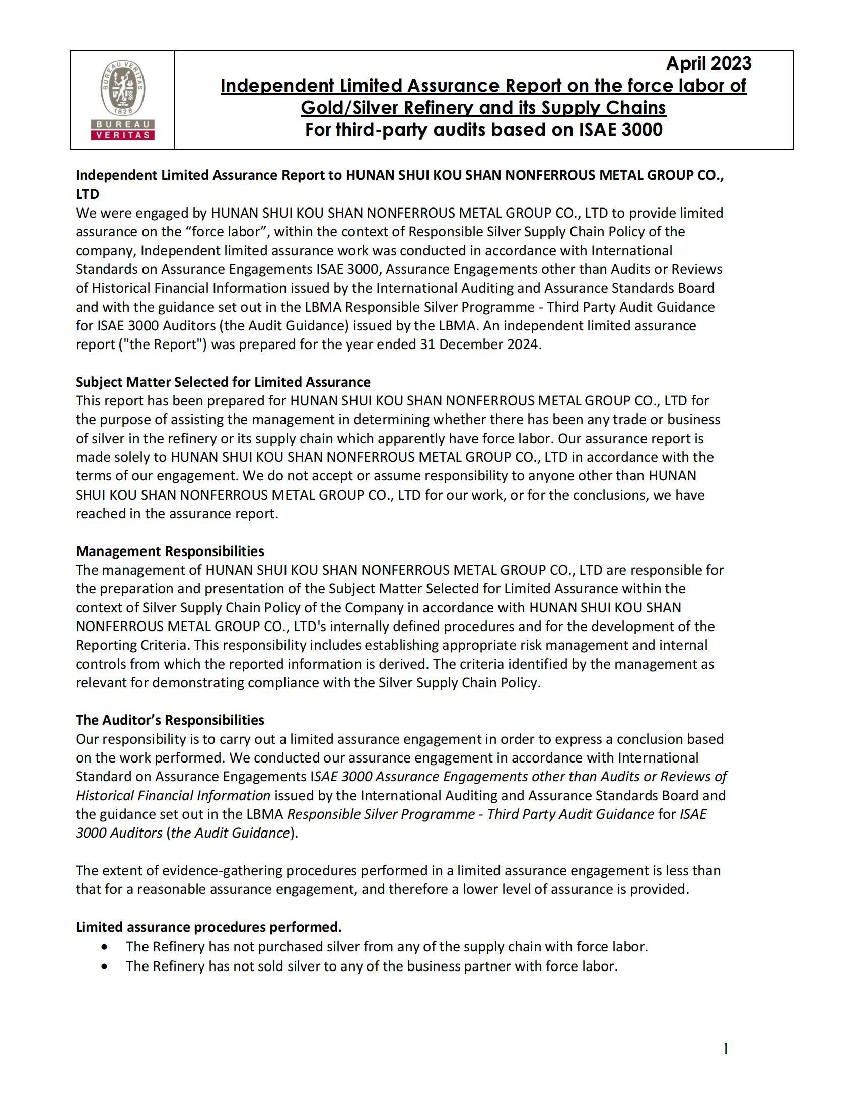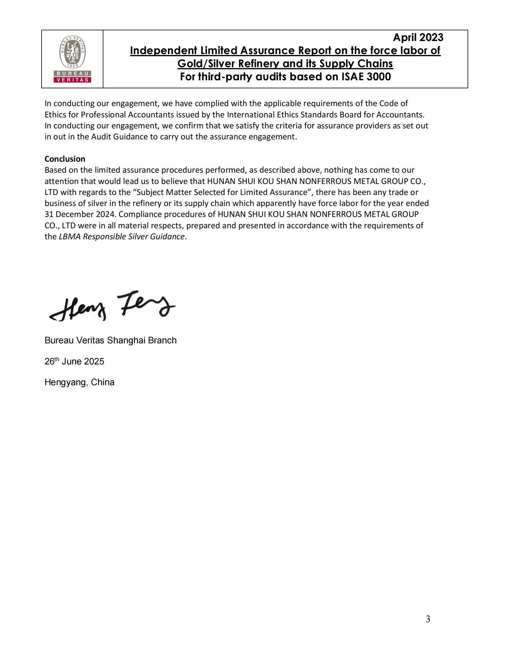 Limited Assurance Report_Silver_HUNAN SHUI KOU SHAN NONFERROUS METAL GROUP CO., LTD